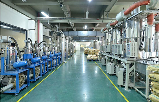 中央供料系統采用高壓鼓風機真空輸送方式,通過集中的管路系統將塑料原料從儲料罐輸送到中央干燥系統,然后將干燥后的原料輸送到每臺注塑機中。中央輸送系統采用“一臺機器一根管”的設計方式,保證整個系統運行穩定,絕無堵料的現象發生。高壓風機配合中央干燥系統使用,可使用干燥的空氣對原料進行輸送,防止干燥后的原料回潮。同時在每個輸送循環后會對輸送管線進行清理,確保管路內沒有殘余的粒料,在避免原料回潮的同時,也保證了加入注塑機中的原料性能的一致。在高壓鼓風機真空負壓作用下,原料中原有的粉塵會通過粉塵過濾系統被過濾出來,有助于提高成型產品的質量.